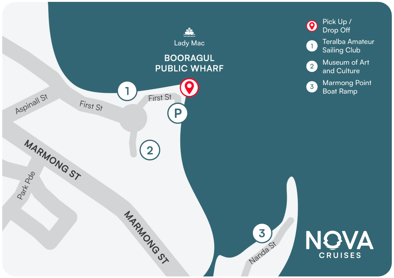 Aboard “Lady Mac” – Departs Booragul Public Wharf next to Lake Mac Art Gallery